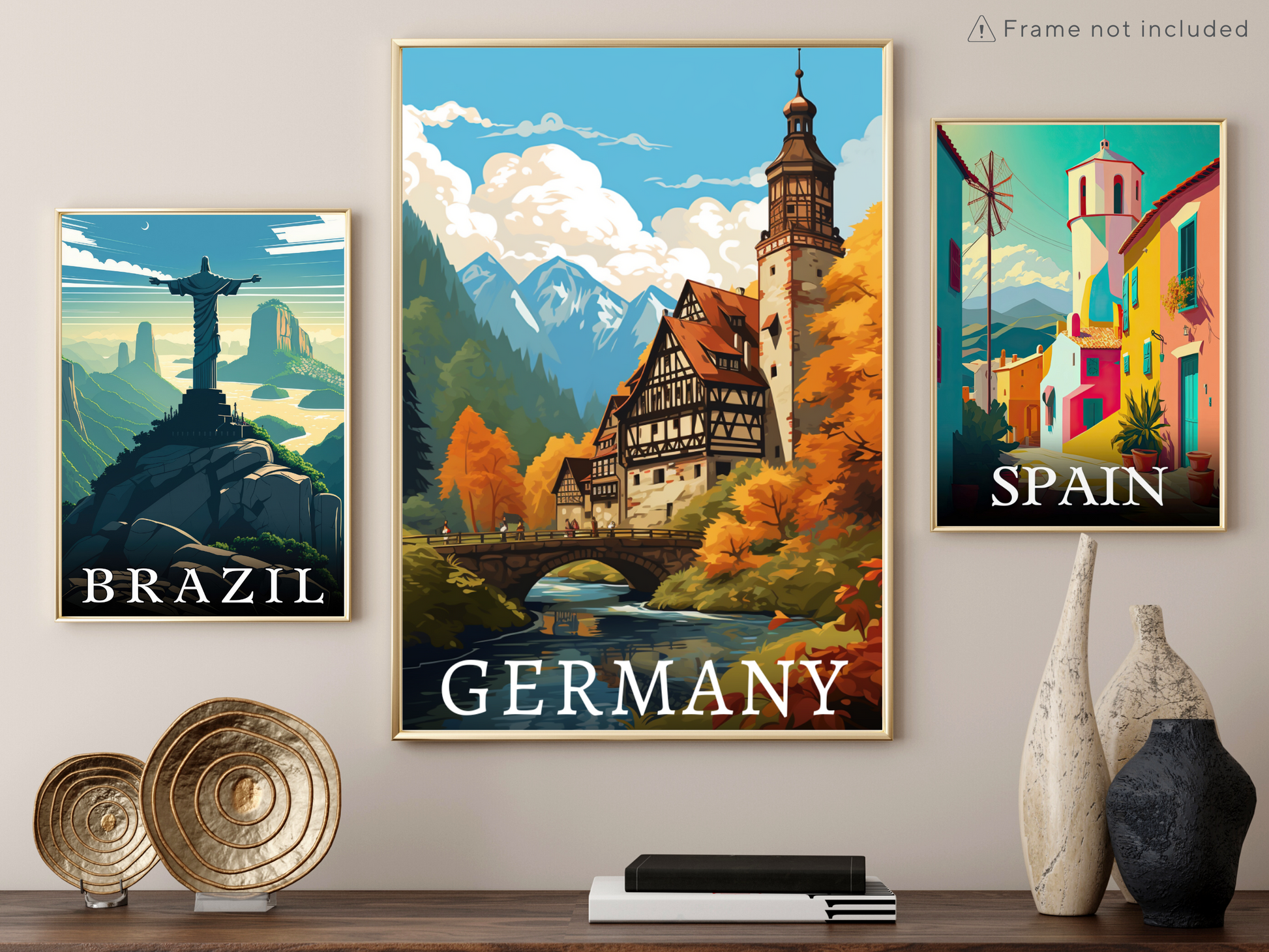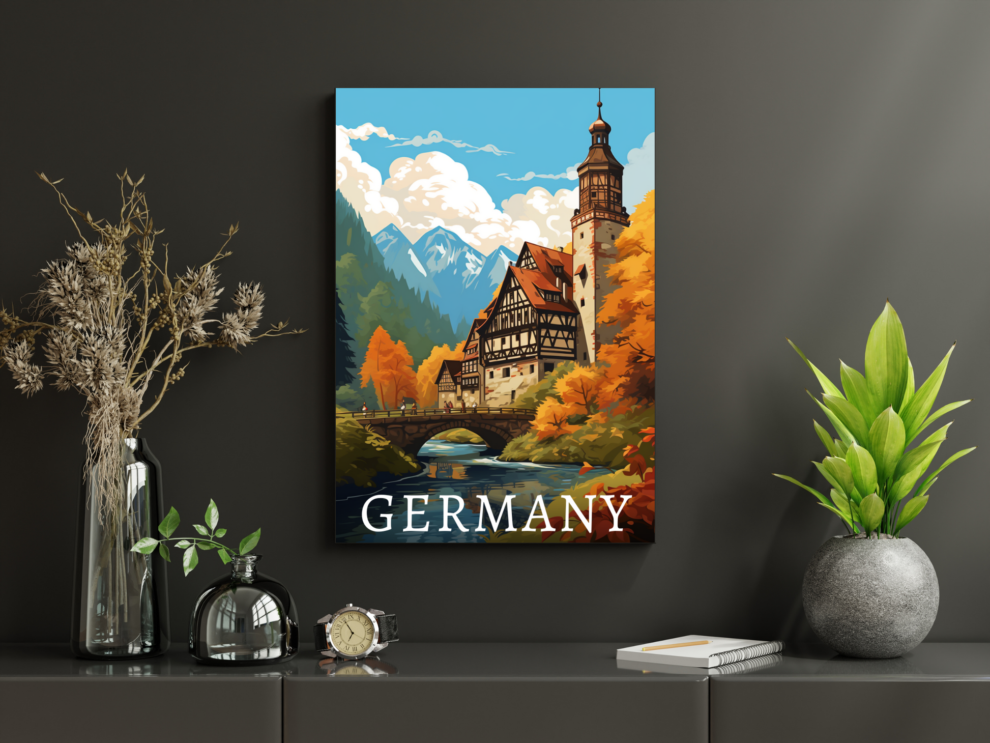 Immerse yourself in the beauty of Germany with our satin finished poster. This stunning artwork showcases a traditional German village in autumn, nestled among majestic mountains under blue skies. It captures the essence of German charm and natural splendor. Instantly transport yourself to this idyllic scene and bring the warmth and tranquility of Germany into your space.