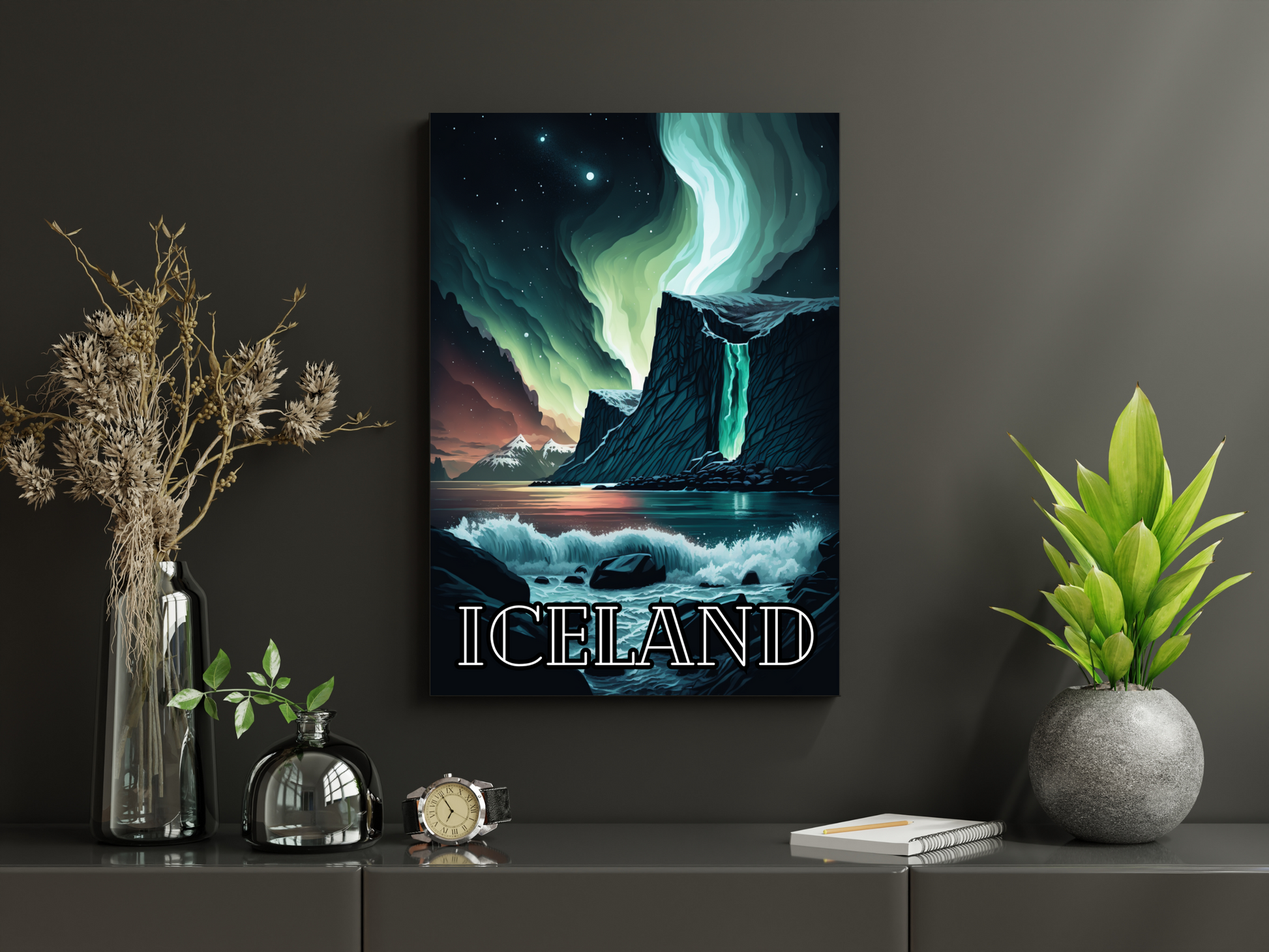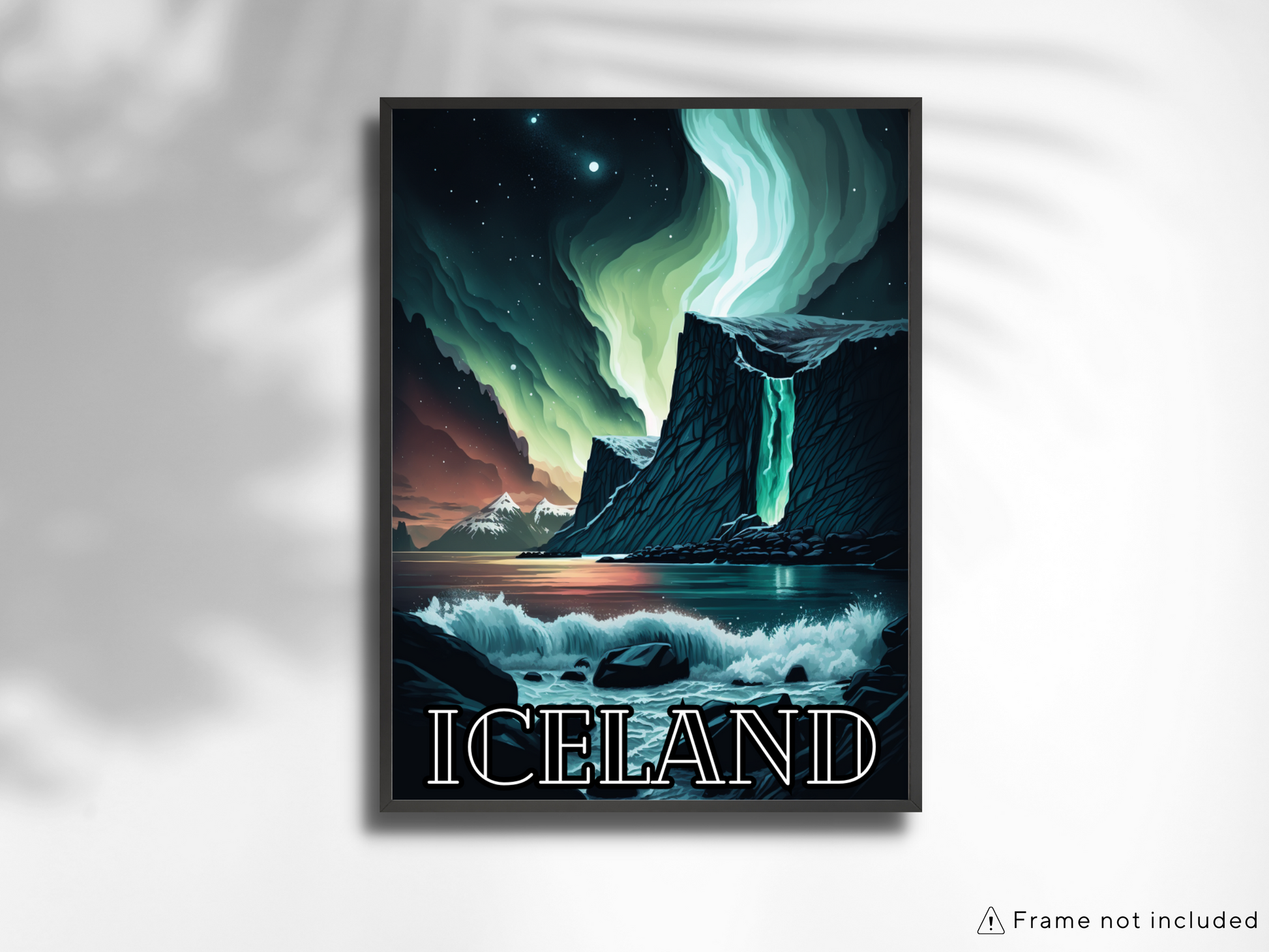 Introducing the perfect addition to your home decor collection - a stunning satin finished poster of Iceland landscape! This breathtaking piece features a starry night sky and northern lights illuminating the night sky. You'll also find Iceland's iconic volcanic mountains with a waterfall, and a serene lake surrounding the mountains. In the distance, the orange hue from a finished sunset adds a dramatic touch to this already stunning piece. This artwork is digitally created, and with its high-quality resolution, it's perfect for adding a touch of Iceland's natural beauty to any room in your home. Get ready to be transported to the land of fire and ice with this unique piece of art.