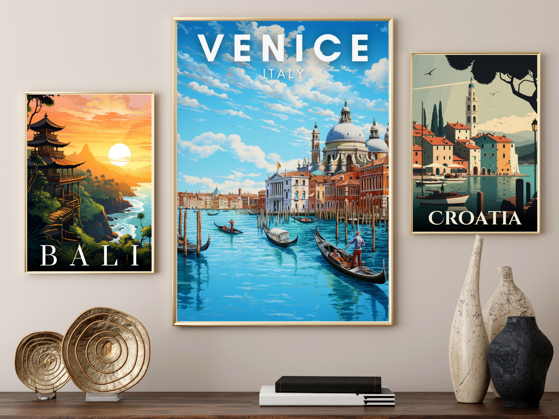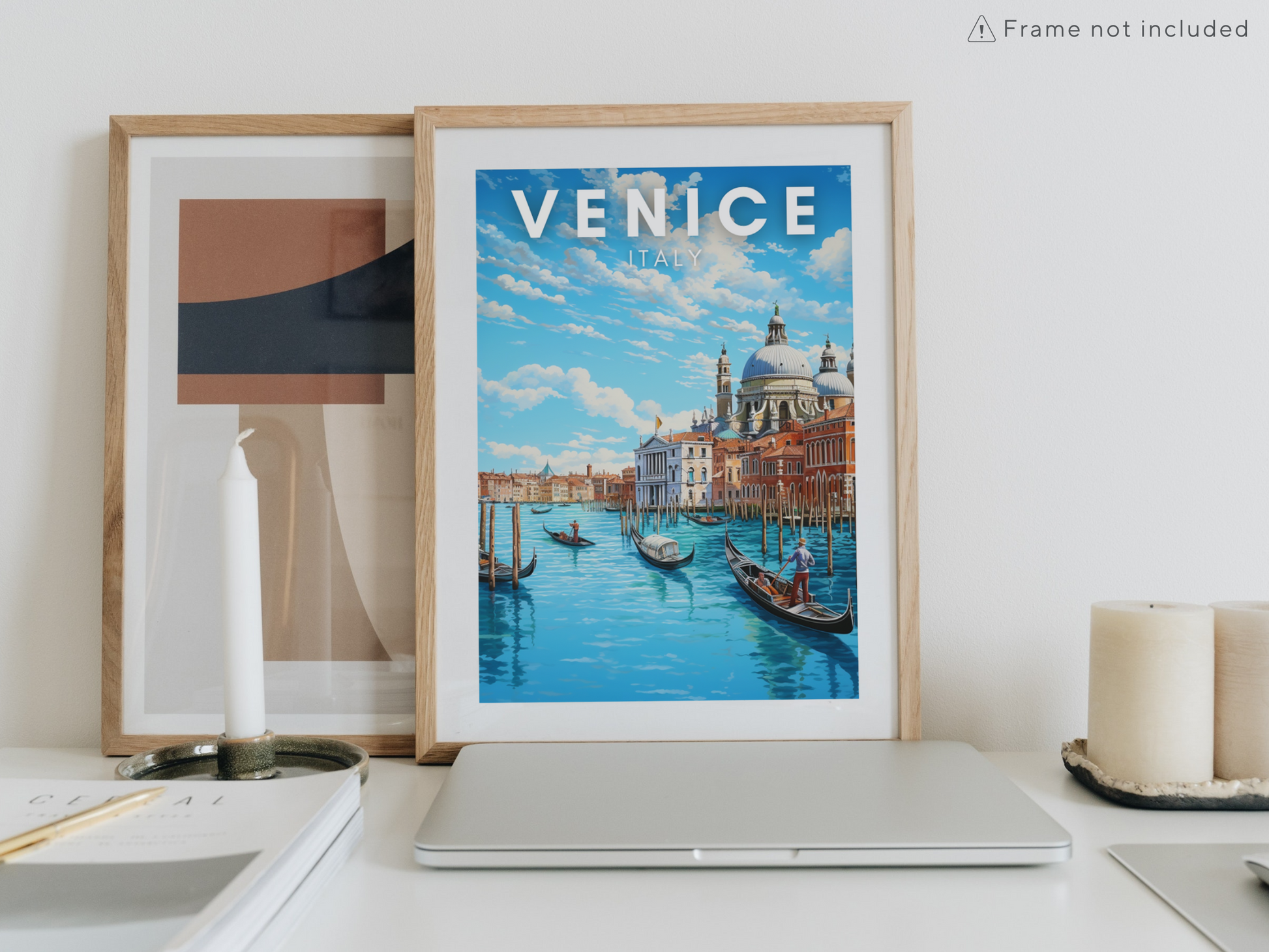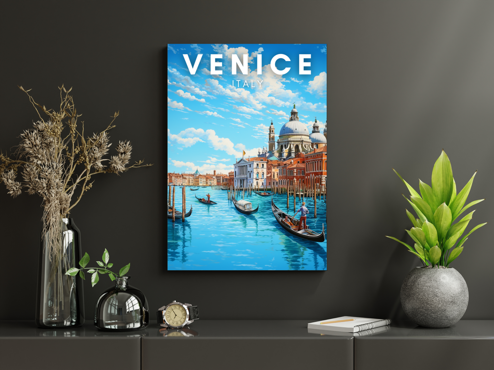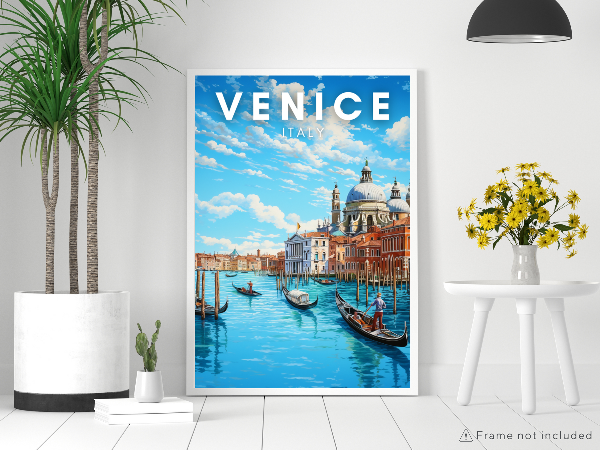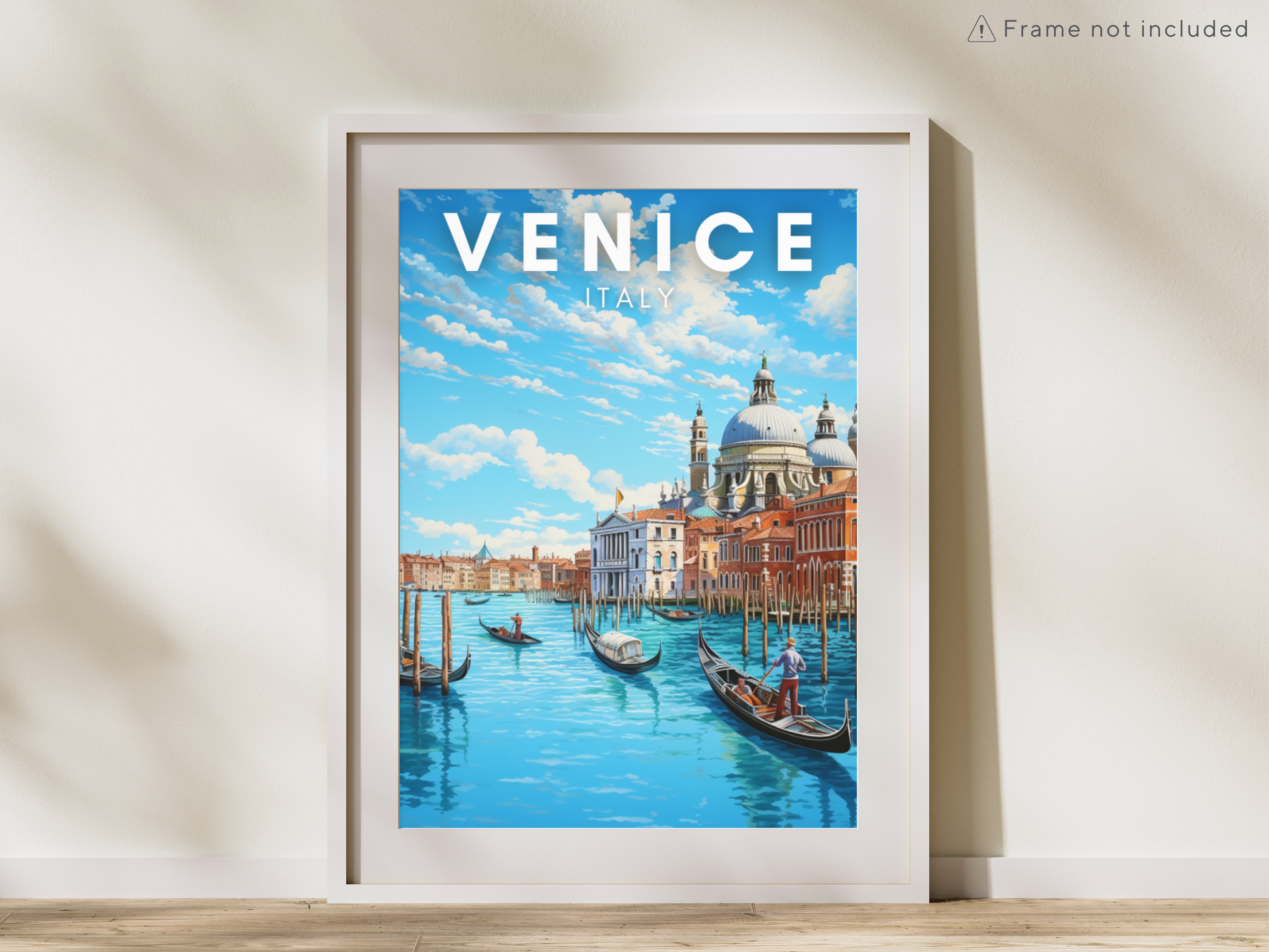 Immerse yourself in the sunlit enchantment of Venice with our captivating digital poster. Behold the iconic scene of classic Venetian buildings gracing the water's edge, basking in the golden glow of a sunny day. The tranquil canals come alive as charming gondolas gracefully navigate the picturesque waterways.
