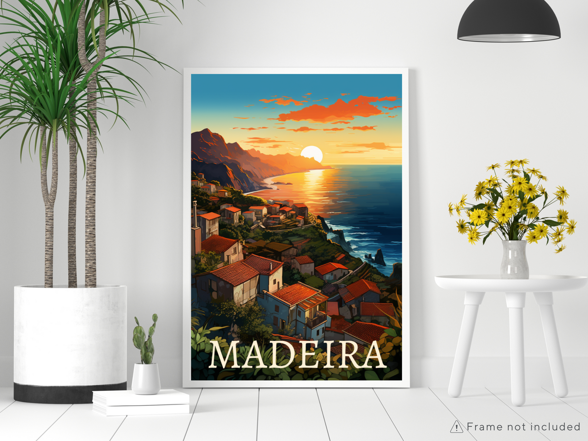 Transport yourself to the captivating beauty of Madeira with our digital downloadable poster. This stunning artwork captures the essence of the Madeiran seaside, where dramatic cliffs meet charming villages, all bathed in the warm glow of a mesmerizing sunset. Let this exquisite poster become a window to Madeira's natural wonders, serving as a constant reminder of the beauty and serenity that await you on this captivating island.