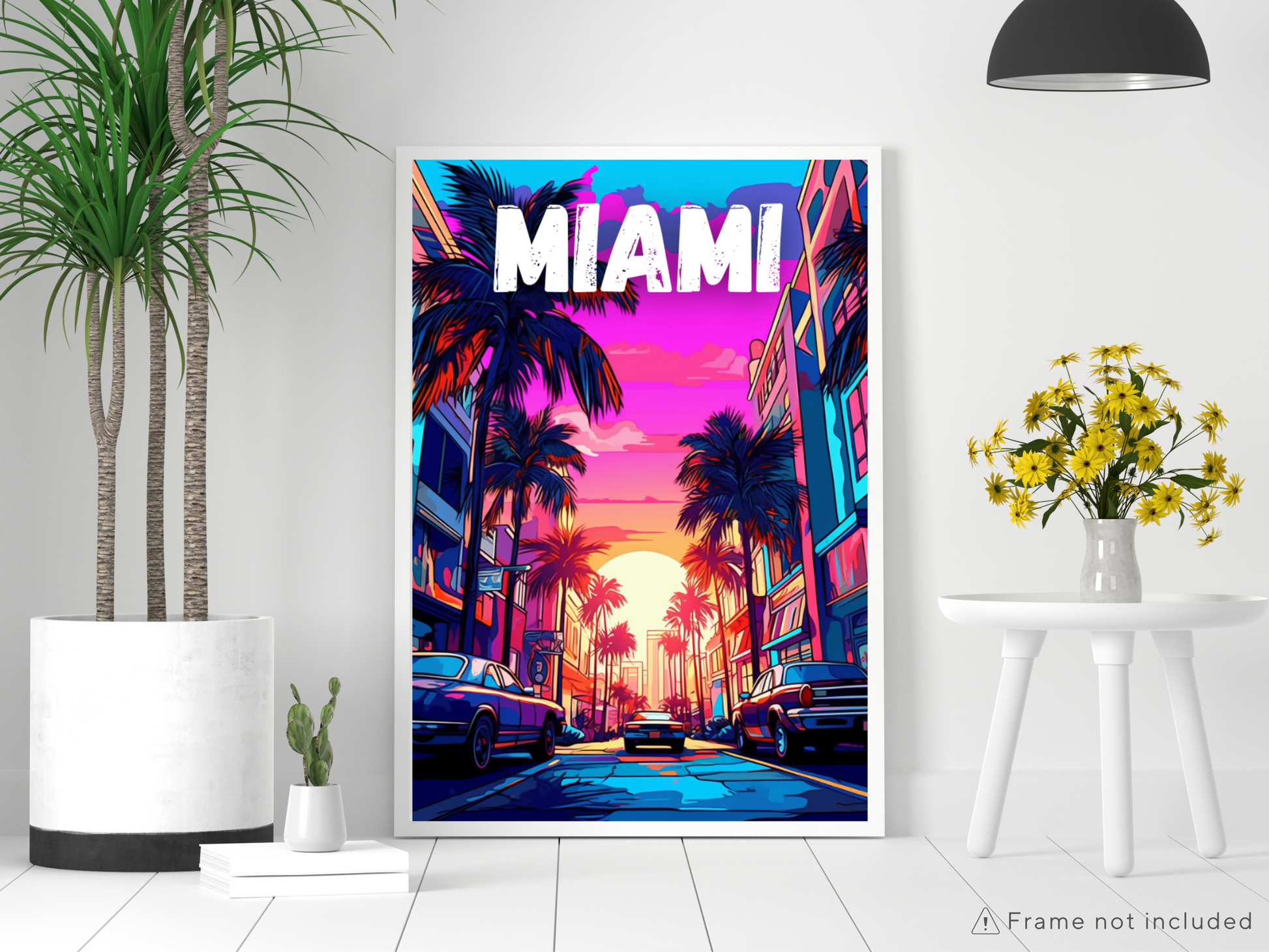 Bring the vibrant essence of Miami's iconic streets into your space with our digital downloadable poster. This stunning artwork captures the heart of this lively city, featuring a picturesque street adorned with swaying palm trees and a mesmerizing sunset in the distance. The classic Miami vibes are beautifully portrayed through the blend of orange, pink, and blue hues, instantly adding a touch of tropical elegance to your decor.