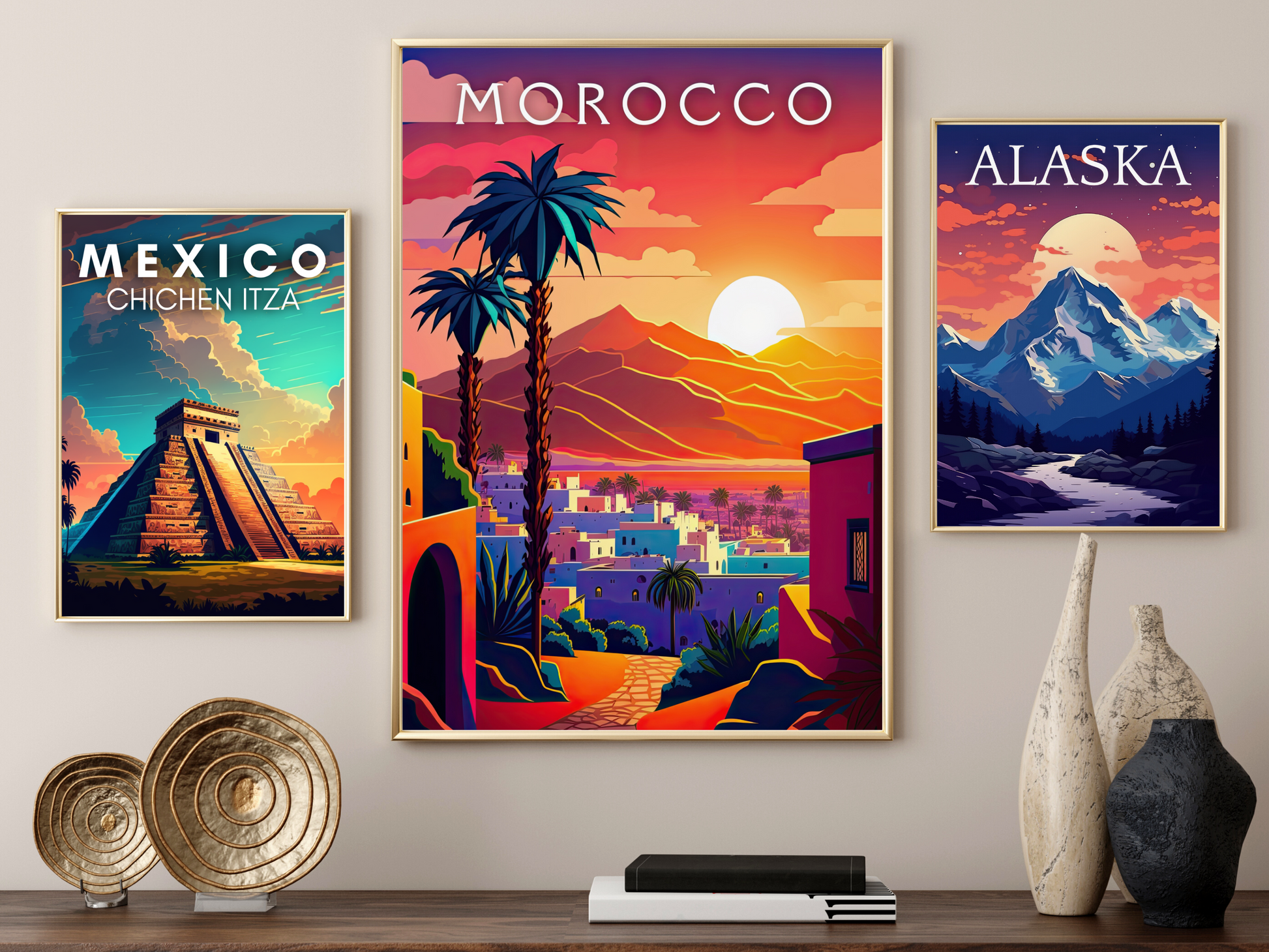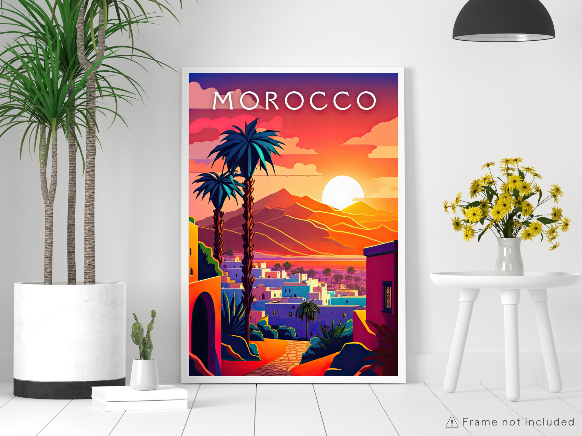 Transport yourself to a vibrant Moroccan cityscape with this stunning digital poster. The warm hues of a sunset over traditional architecture capture the country's unique beauty and rich culture. Instantly downloadable, it's an affordable and easy way to add a touch of international flair to any room. Perfect for travel lovers and art enthusiasts alike, this eye-catching piece is a must-have.