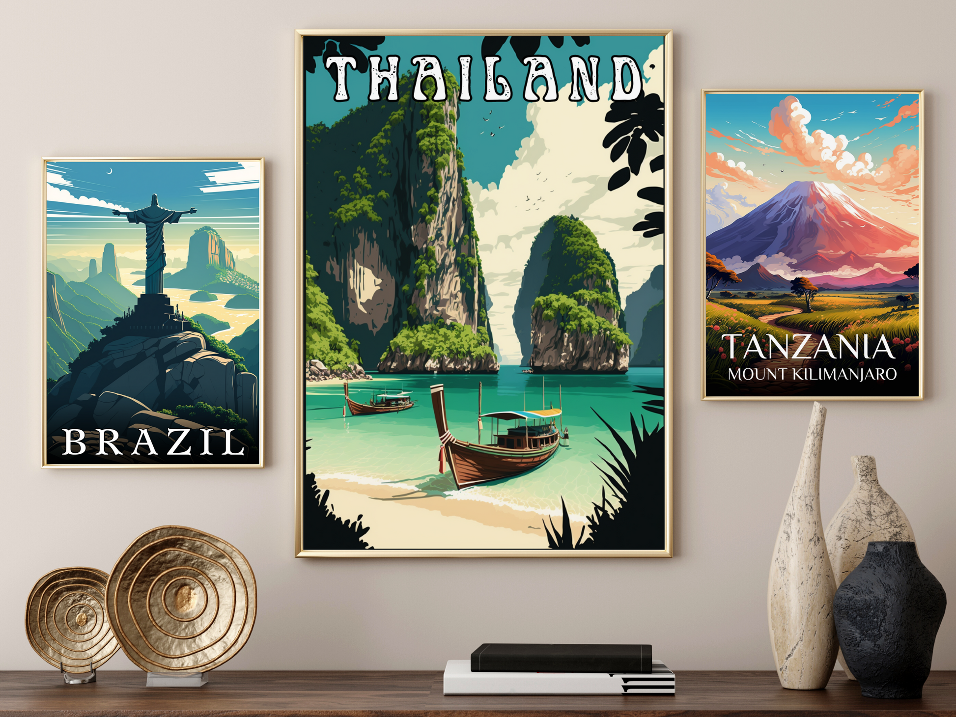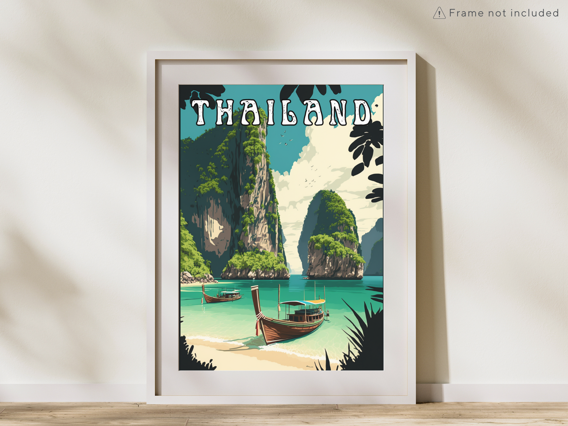 This digital downloadable poster invites you to escape to the pristine shores of Thailand's Phi Phi Islands, capturing the stunning beauty of the region's turquoise waters and powder-white sands. The picture-perfect setting is completed by the towering limestone cliffs that encircle the beach, creating a breathtaking backdrop that will transport you to a world of pure tropical bliss.